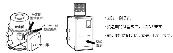 | 製品名および型式 | ・石油ふろがま JK、JK2、JK-N、JPS-T3、JPK-N3、CK-8・8E、CK-9・9E、CK-10・10S、CK-11・11S ・追焚付石油給湯器 JIB-T、JIB-2T、JIB-4、JIB-5*、JIB-6*、JIB-7* (*には英字が入る場合があります) [販売等期間] 1983年(昭和58年)4月~2001年(平成13年)9月 製造 | |