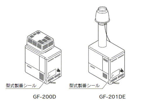 | 製品名および型式 | 型式:GF-200D=ガス種:LP/製造番号:040142~064540/ガス種:都市ガス/製造番号:005617~009390 型式:GF-201DE=ガス種:LP/製造番号:017147~029121/ガス種:都市ガス/製造番号:005131~008146 ※型式製番シールの場所:GF-200D・201DEの本体正面に型式製番シールがあります。 [販売等期間] 2001年1月~2003年12月(製造) | |