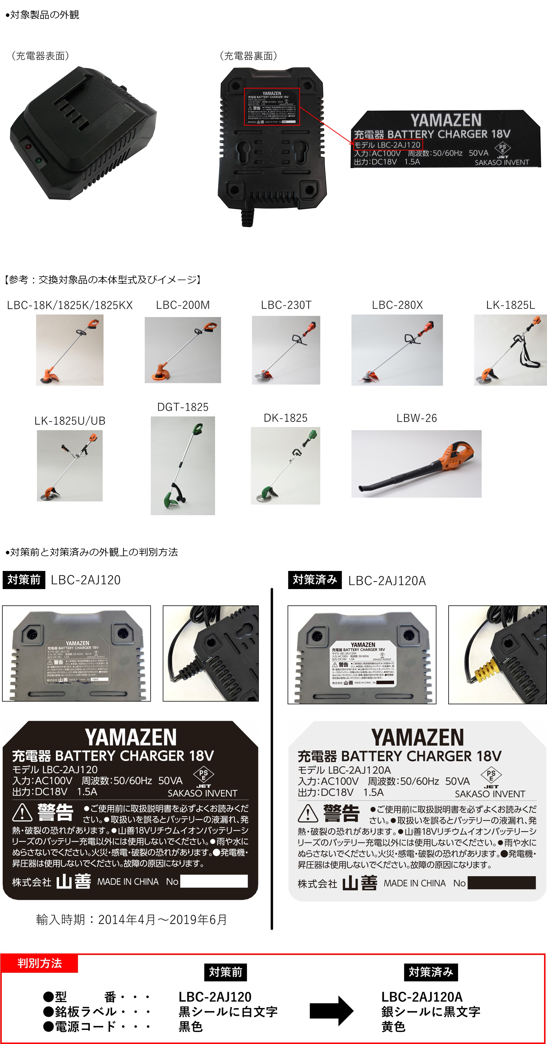 製品名および型式 | 製品名: YAMAZEN 充電器 BATTERY CHARGER 18V 型番、JANコード: LBC-2AJ120、4983771977190 [販売期間] 2014年4月~2019年6月 | |